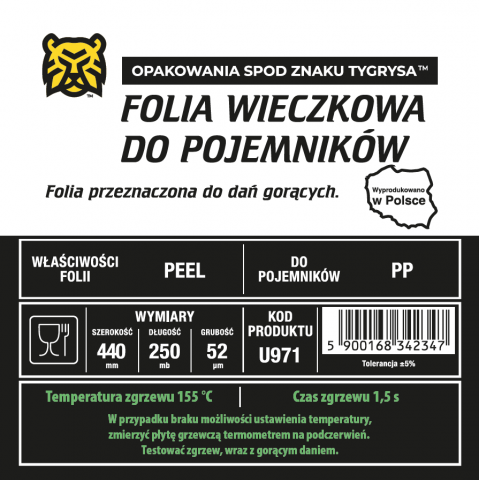 Folia wieczkowa, barierowa, transparentna – wykonana z folii PET/PE o szeroko艣ci 440mm i d艂ugo艣ci 250 metr贸w bie偶膮cych. S艂u偶y do zgrzewania i zamykania pojemnik贸w PP.