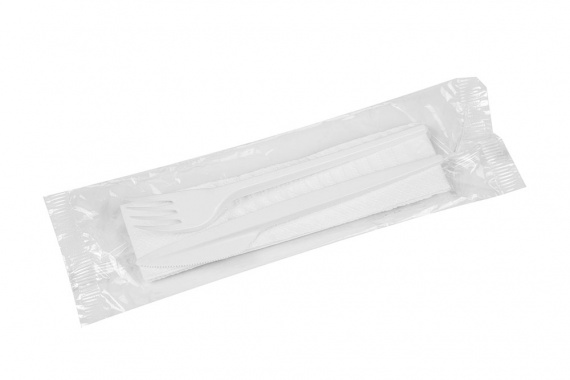 Komplet widelec, nóż, serwetka w kolorze białym. Zapakowane hermetycznie.