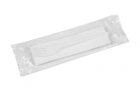 Komplet widelec, serwetka w kolorze białym. Zapakowane hermetycznie.