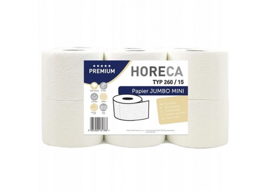 Wysokiej jakości biały papier toaletowy JUMBO MINI HORECA PREMIUM Typ 260/15.
