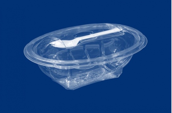 ojemnik transparentny owalny łamany + widelec z tworzywa PET o pojemności 500 ml. Doskonale nadaje się do sałatek, galartów, wyrobów garmażeryjnych, surówek czy cateringów.