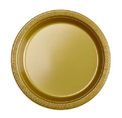 Talerz plastikowy w kolorze złotym o średnicy 22cm, idealnie sprawdzi się na imprezach plenerowych jako element dekoracyjny.
