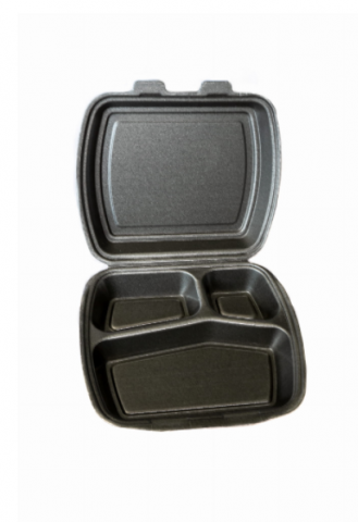 Menu box w kolorze czarnym trzydzielny, wykorzystywany głownie z restauracjach i cateringu do pakowania dań na wynos. Opakowanie wykonane z mieszanki styropianowej co zapewnia utrzymacie temperatury potraw. Opakowanie posiada atest do żywności, pojemnik nie nadaje się do podgrzewania w mikrofalówce. Opakowanie 125szt.